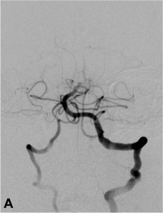 Exemple de traitement par remodeling. A. Angiographie carotidienne montrant l’anévrysme. B. Montée du